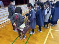 体育館では、3年生がランドセルを背負う体験をさせてあげたり、自分たちが作った紙製フリスビー